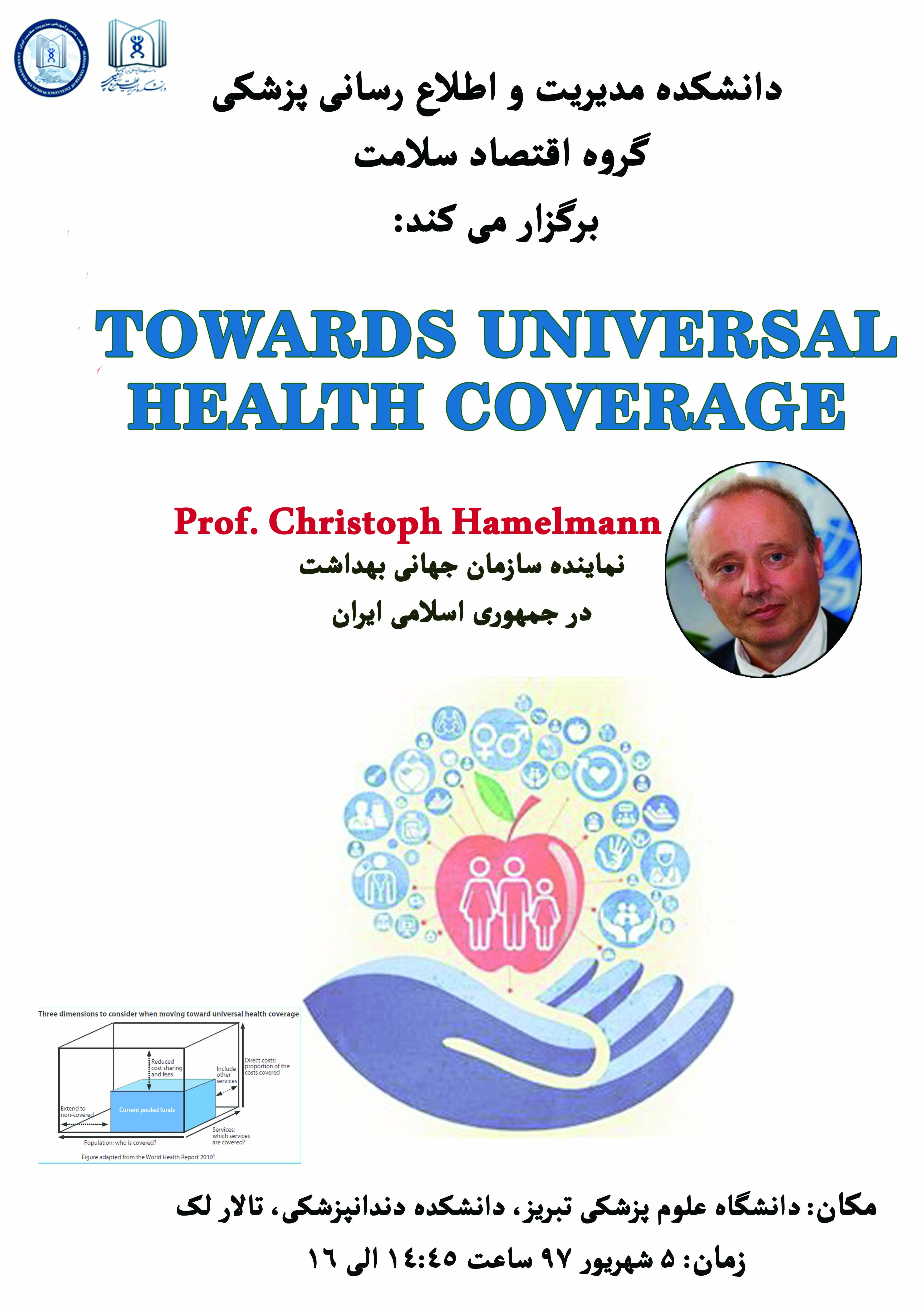 دانشکده مدیریت و اطلاع رسانی پزشکی، سخنرانی علمی با عنوان "TOWARDS UNIVERSAL HEALTH COVERAGE" با حضور دکتر کریستوف هاملمان ، نماینده WHO در ایران برگزار می کند.