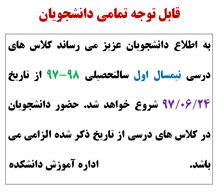 به اطلاع دانشجویان عزیز می رساند کلاس های درسی نیمسال اول...