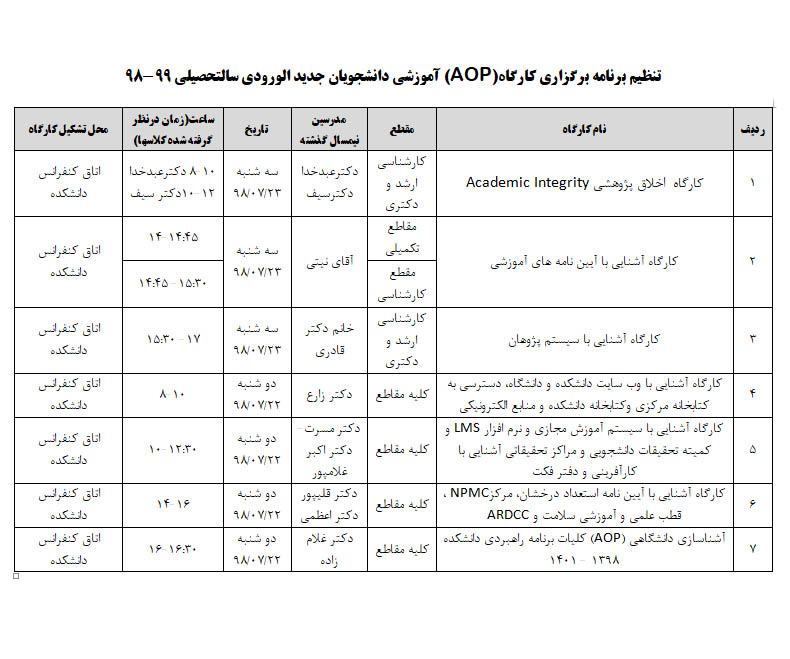 قابل توجه دانشجویان ورودی جدید کلیه مقاطع تحصیلی در سالتحصیلی 99-98، کارگاه آموزشی و توجیهی طبق روال سال گذشته در روزهای دوشنبه و سه شنبه، 23و22 مهر ماه 98 برای دانشجویان جدیدالورود سالتحصیلی 99-98 در تمامی مقاطع تحصیلی طبق برنامه تنظیمی در محل سالن اجتماعات دانشکده برگزار خواهد شد.حضور دانشجویان فوق در این کارگاه الزامی می باشد.
