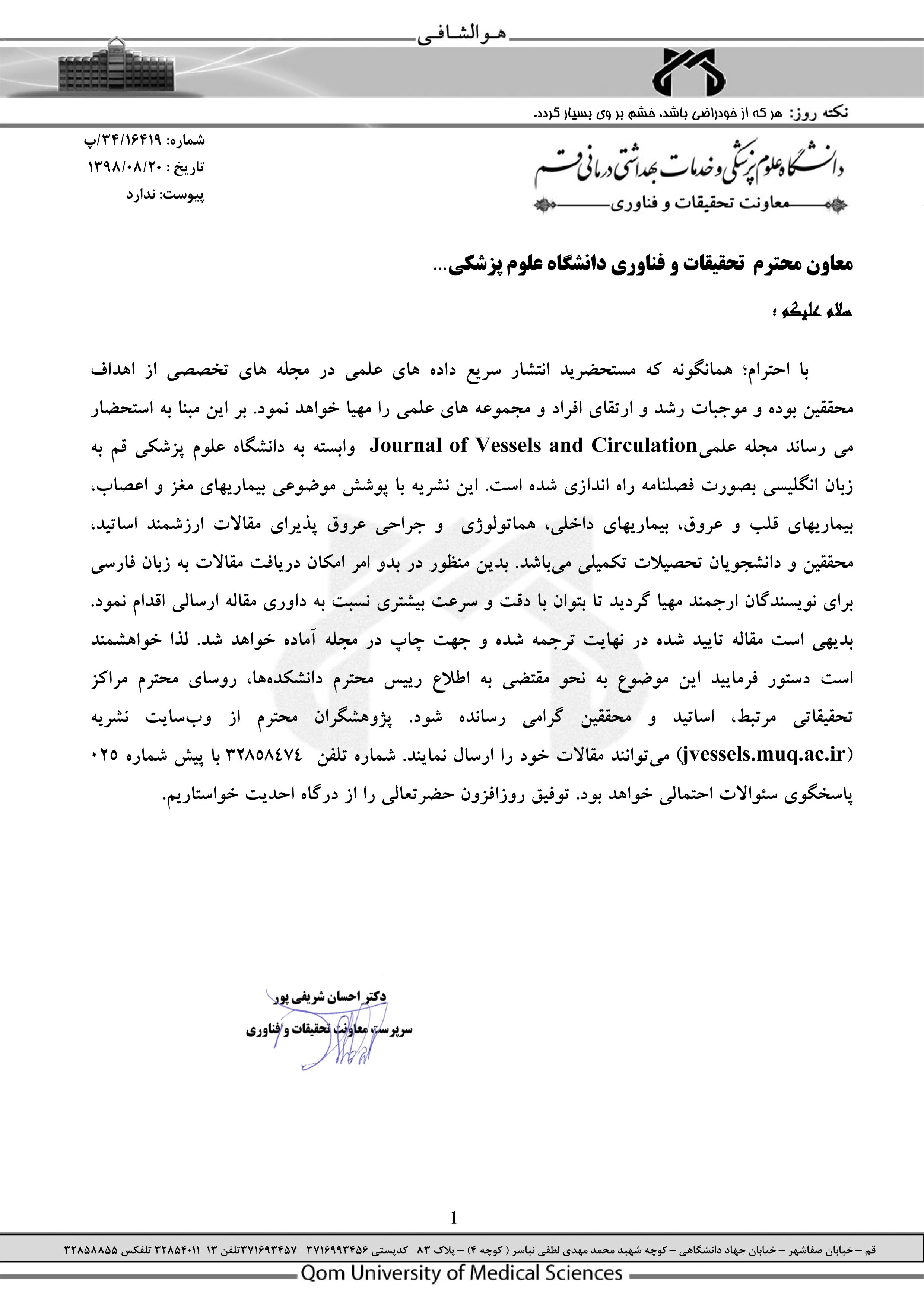 فراخوان مقاله جهت نشریه: Journal of Vessels and Circulation