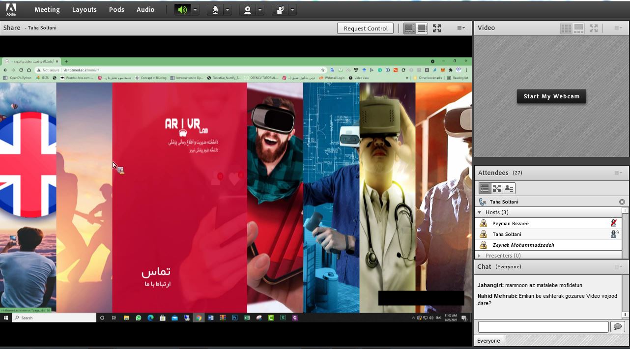 اولین نشست آنلاین گروه فناوری اطلاعات سلامت در مورخه 5 خرداد ماه 1400 ، در بستر اداب کانکت برگزار گردید. در این جلسه، ابتدا آقای دکتر پیمان رضایی در خصوص اهمیت و الزامات مربوط به این فناوری، توضیحاتی را ارائه نمودند، سپس خانم افسون اسدزاده، در خصوص مفاهیم و معماری سیستم واقعیت مجازی، پلتفرم های سخت افزاری و نرم افزاری، قابلیت ها و کاربردهای مختلف واقعیت مجازی و افزوده در حوزه سلامت با تمرکز بر آموزش پزشکی مباحثی ارائه دادند. در ادامه نیز آقای دکتر طاها صمدسلطانی توضیحاتی در خصوص آزمایشگاه واقعیت مجازی و افزوده دانشکده مدیریت و اطلاع رسانی پزشکی و پروژه های جاری آن ارائه دادند. لینک وب سایت آزمایشگاه واقعیت مجازی در ادامه ذکر شده است. http://vls.tbzmed.ac.ir/mmivr/