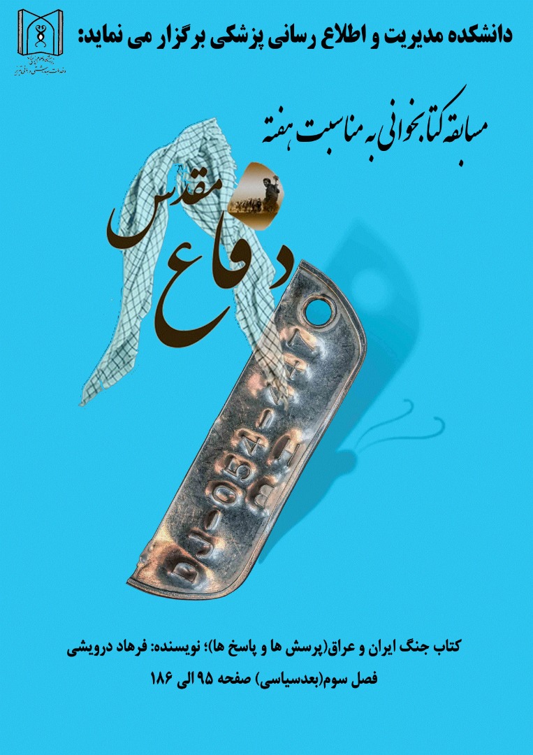 بمناسبت فرارسیدن هفته پرافتخار دفاع مقدس و گرامیداشت یاد و خاطره های ایثار و فداکاری آحاد ملت شریف و مقاوم ایران در برابر استکبار جهانی و ایادی منطقه و فرامنطقه ای آن، این دانشکده در نظر دارد مسابقه کتابخوانی از فصل سوم کتاب "جنگ ایران و عراق - پرسش ها و پاسخ ها" نوشته فرهاد درویشی سه تلانی استادیار دانشگاه بین المللی امام خمینی (ره) با موضوع ابعاد سیاسی بصورت چهار گزینه ای رد بین همکاران علاقمند برگزار نماید.