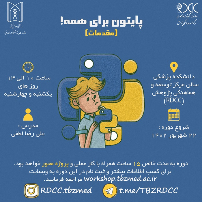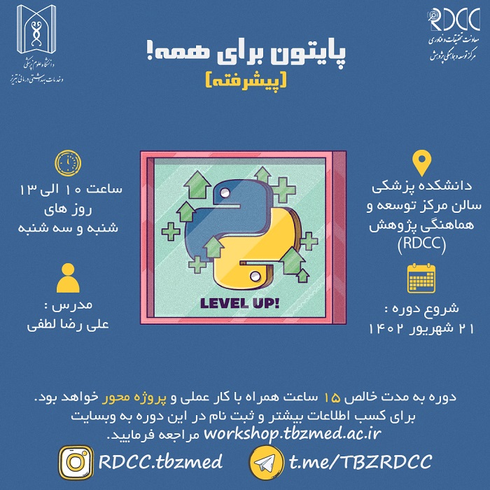 در راستای توانمندسازی پژوهشگران و محققین، مرکز توسعه و هماهنگی پژوهش دانشگاه(RDCC) کارگاه پایتون برای همه را به صورت مجزا مقدماتی و پیشرفته از تاریخ 21 شهریور ماه برگزار خواهد نمود. خواهشمند است ترتیبی اتخاذ گردد تا اعضای محترم هیات علمی، دانشجویان و پژوهشگران جهت ثبت نام و شرکت در این کارگاهها اقدام نمایند. پیشاپیش از حسن همکاری حضرتعالی سپاسگزاریم.